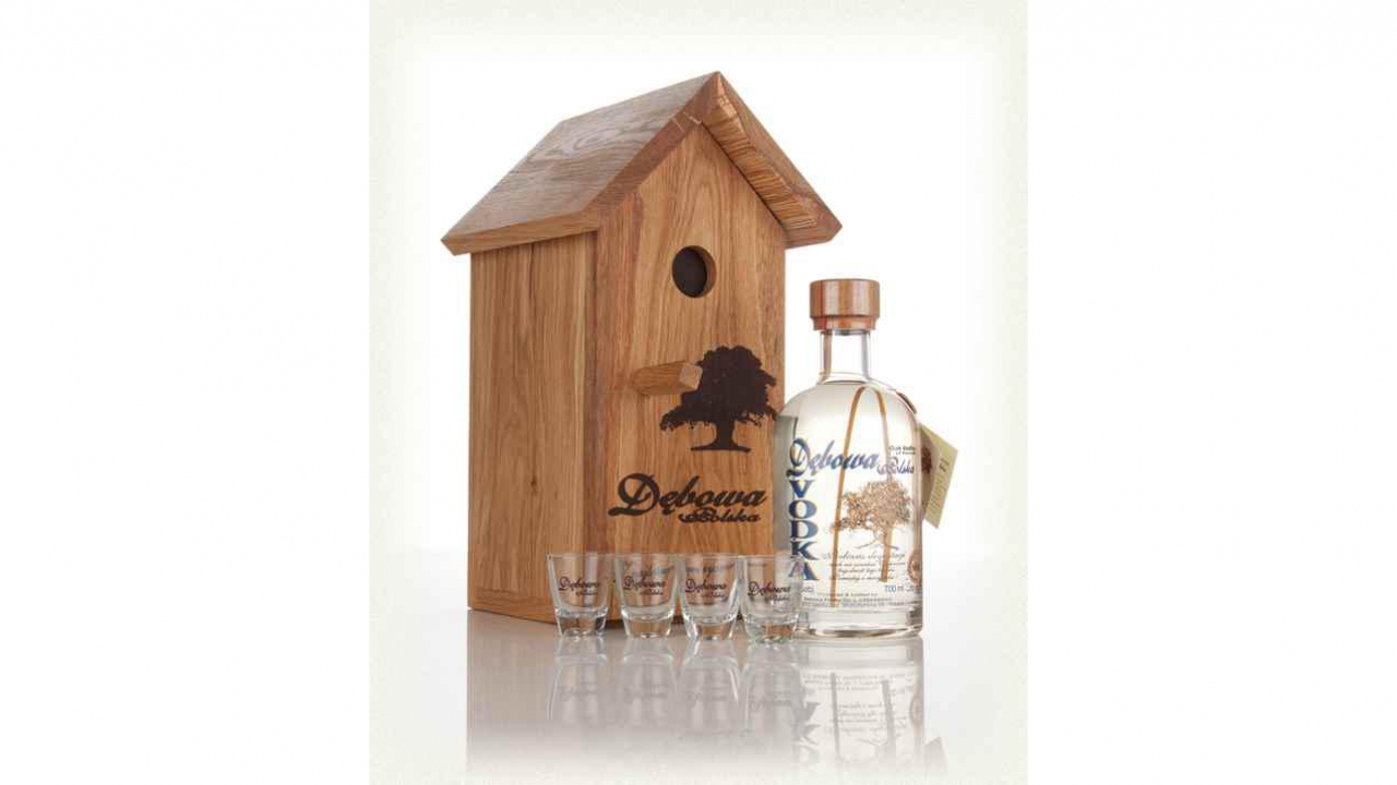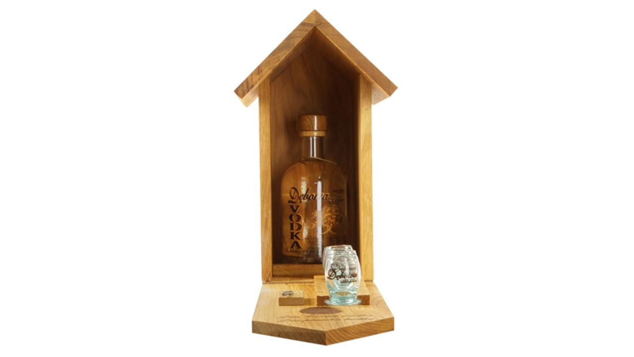 Cabane à oiseaux en bois pour vodka avec vodka dowa (0,7 l) et 4 verres.