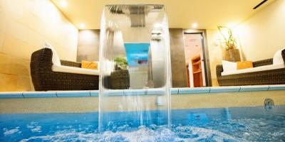 Espace spa avec piscine intérieure, hammam, sauna finlandais, salle de repos et bain à remous extérieur