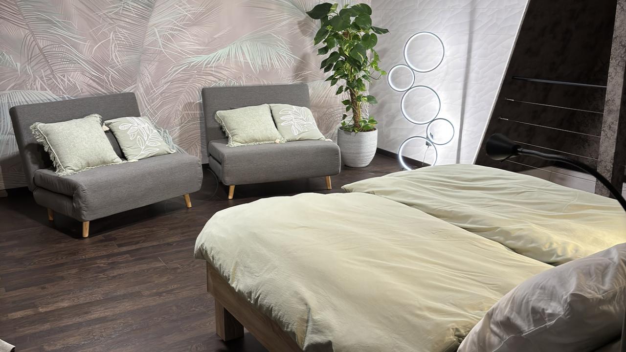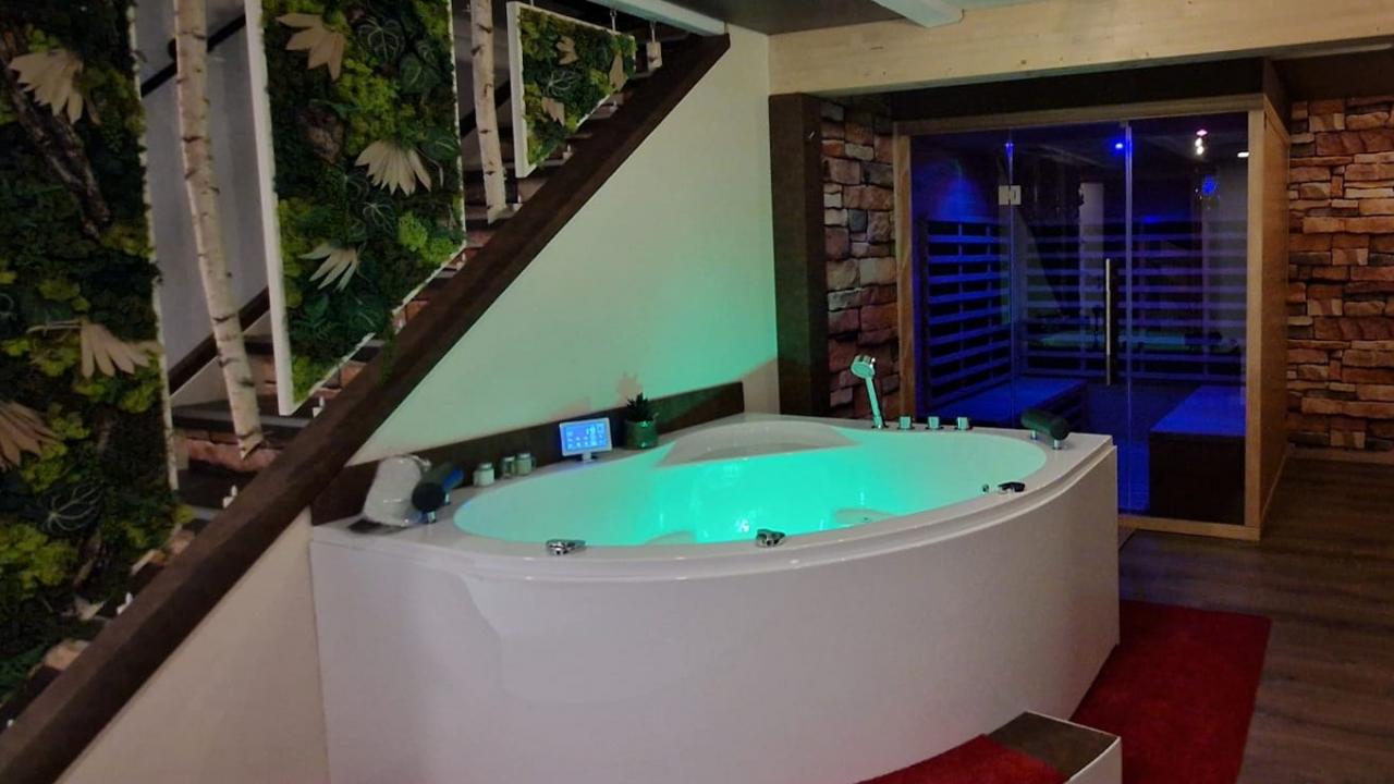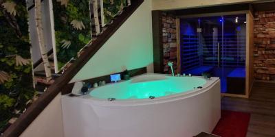 Vous séjournez dans un studio en duplex avec spa privatif, conçu pour la détente et le confort. L’espace s’organise sur deux niveaux : au rez-de-chaussée, une zone bien-être invite à la relaxation avec sauna infrarouge, douche hammam, baignoire balnéo, fauteuils massants et coin repas. À l’étage, une chambre à l’ambiance douce et feutrée vous accueille pour une nuit paisible.