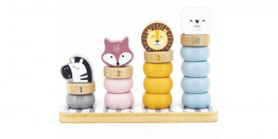 Un zèbre, un renard, un lion et un ours polaire aident les enfants à apprendre les chiffres de 1 à 4. Les cônes en bois sont faciles à saisir et peuvent être empilés sur le bâton en bois au milieu.