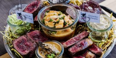 Ce plateau dégustation vous sera servi avec des légumes de saison, une garniture au choix, d'un assortiment de différents sauces et beurres maisons ainsi que d'une bouteille de vin rouge qui vous fera découvrir une cuvée exclusive de la maison. Un vrai régal !