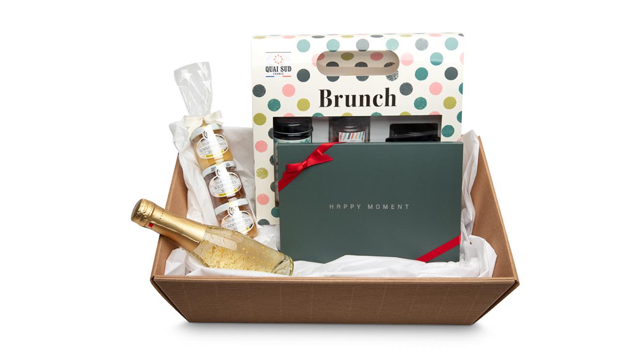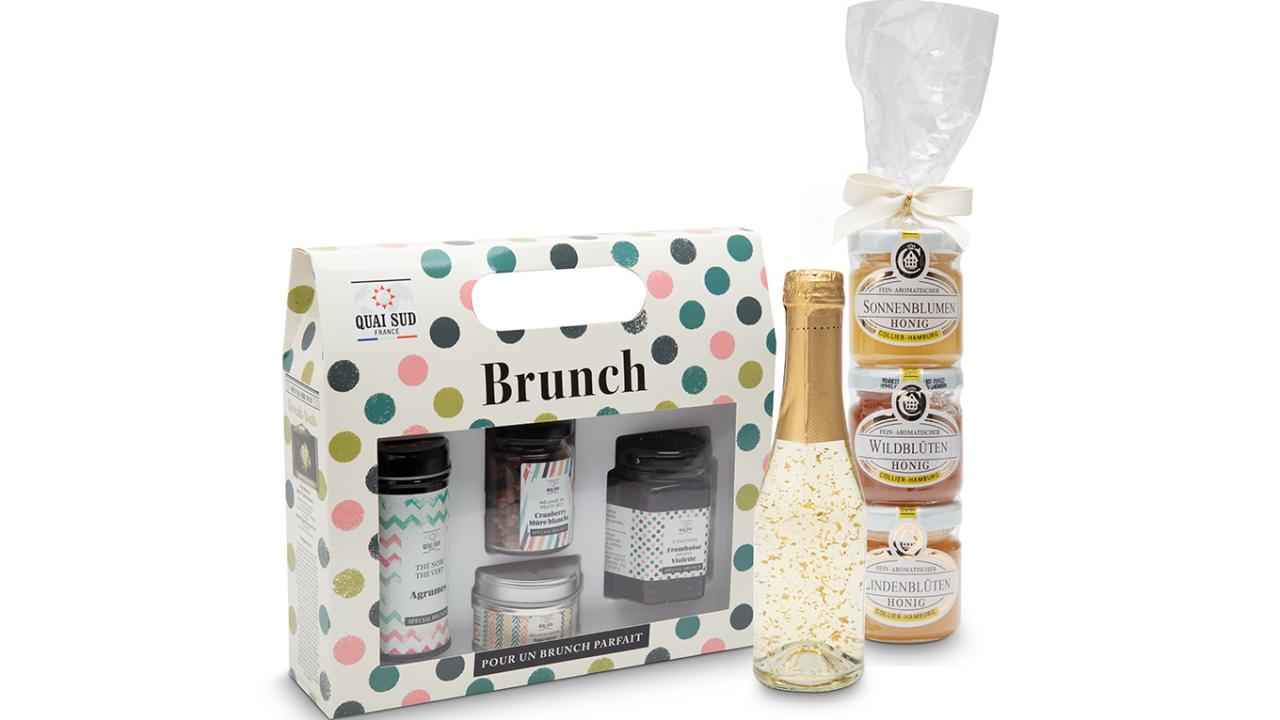 Le panier cadeau pour un brunch parfait est composé d'un bon cadeau pour un brunch gourmand pour 2 personnes dans le canton de Vaud, d'une tour avec 3 types de miel différents, d'un set exclusif spécial brunch et d'une bouteille de champagne additionné de paillettes d'or pour un Brunch@Home parfait.