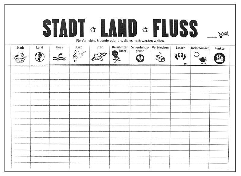 Outre les catégories connues, telles que la ville et la campagne cette version du jeu est étendue aux catégories: chanson, célèbrité, célèbrité morte, le divorce, le crime, le vice et vos souhaits.