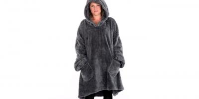 La couverture polaire ultra douce de couleur gris ardoise a été transformée en une version surdimensionnée du traditionnel sweat à capuche. Vous avez ainsi encore plus chaud et pouvez bouger plus librement qu'avec une couverture standard.