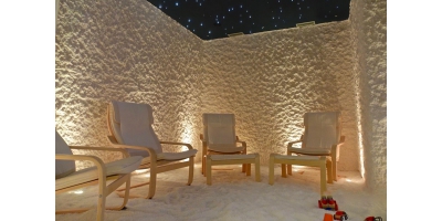 Les séances d’halothérapie se déroulent dans un environnement agréable et évocateur, qui a été conçu pour reproduire l’environnement hypoallergénique des anciennes mines de sel. Les parois de la chambre sont recouvertes de sel: celui-ci a été appliqué uniquement avec de l’eau, qui en favorise l’agglomération et la stabilité.
