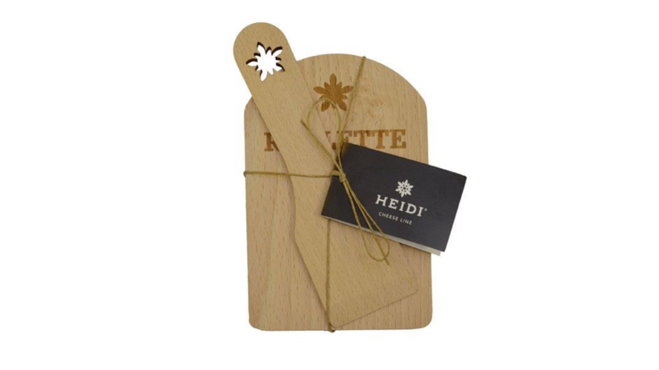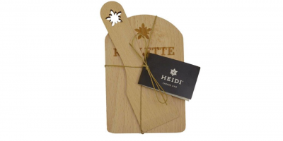 Ce set à raclette se compose d'une spatule à raclette et d'une base au design traditionnel d'edelweiss de la Heidi Cheese Line. Le bois de hêtre est certifié FSC et provient de Suisse.
