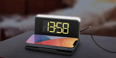 Il vous suffit de poser le téléphone portable sur le réveil pour recharger pendant la nuit par induction. L'écran au format 24 heures s'affiche à l'aide de lumières LED, et il comporte aussi une petite veilleuse. C'est un objet de décoration moderne, pratique et élégant, parfait pour votre table de nuit !
