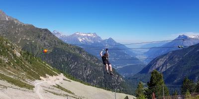 Après une montée en télésiège jusqu’à la Breya, en pleine montagne, l’aventure commence par une première tyrolienne de 540 mètres suspendue au-dessus d’une combe spectaculaire. Une courte marche de 5 minutes permet de rejoindre la seconde tyrolienne, longue de 570 mètres, qui ramène au point de départ dans un décor à couper le souffle.